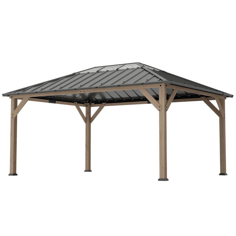Outsunny 12' x 16' Hardtop Gazebo with Galvanized Steel Roof, UPF50+ Wood Permanent Pavilion with Clear Roof Top, Light Walnut