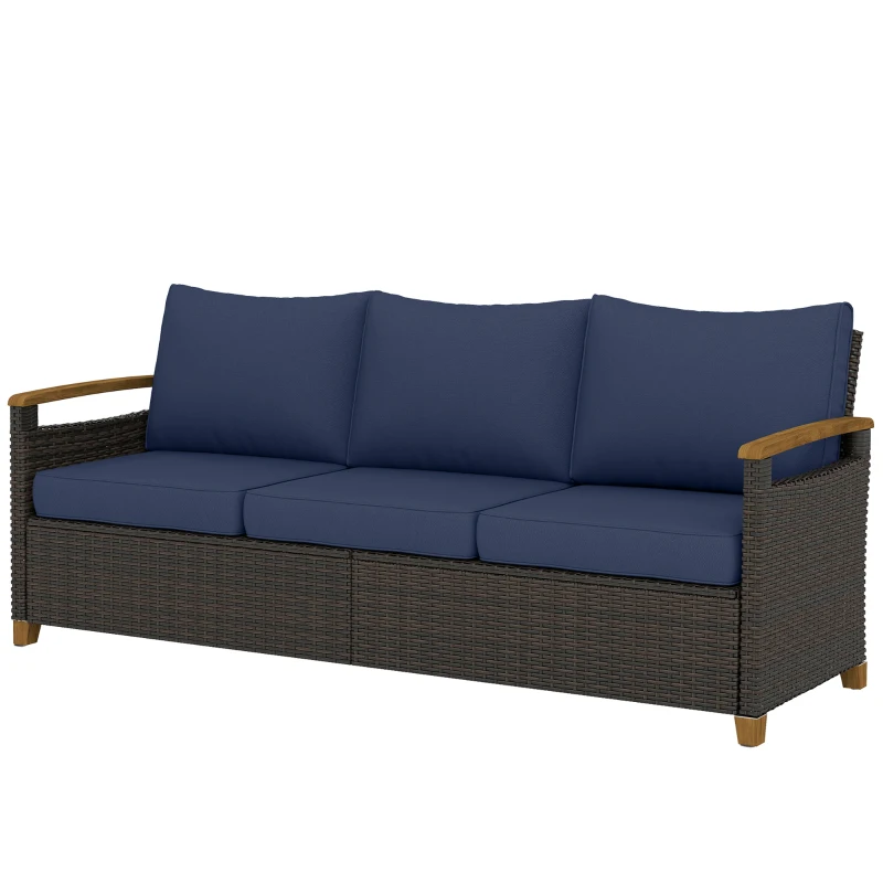 Outsunny 3 Seater Outdoor Couch Sofa, PE Wicker Patio Sofa, Wide Deep Seat, 4" Cushions, Wood-Effect Armrests Legs, Dark Blue